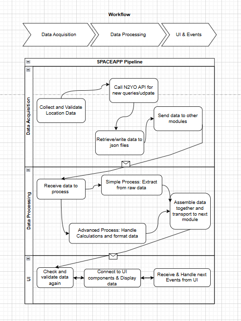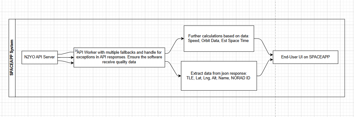 This diagram demonstrates how SPACEAPP collects satellite data from external APIs, processes it through internal modules, and renders it in the user interface.